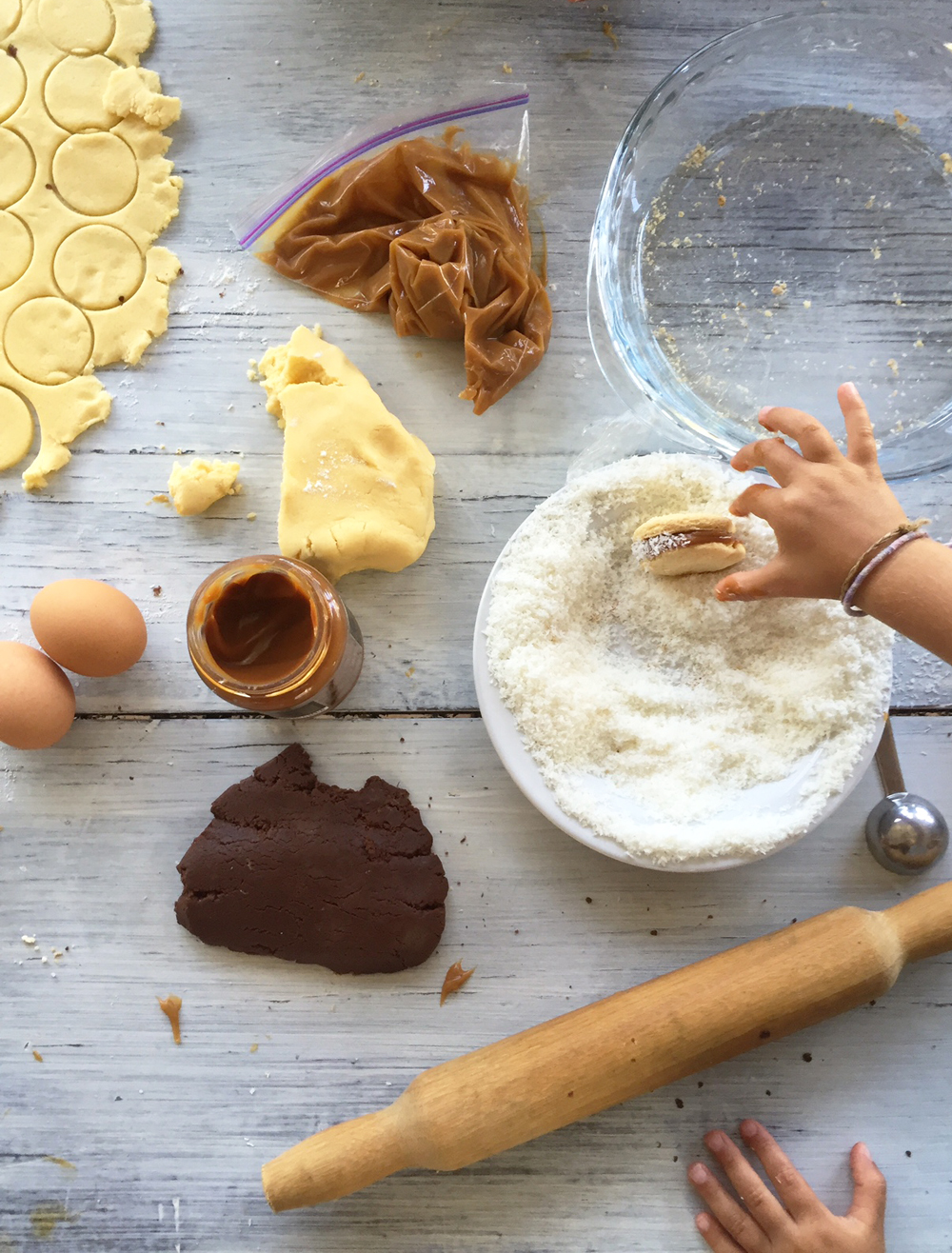 Delfina and Miguel came over to our house one afternoon during our last week in Uruguay and we spent a few hours making alfajores… and taste-testing the dulce de leche (needs must!). Delfina shared her recipes, both for the ‘plain’ ones and the chocolate versions. We started with two types of dough, but by the end of the afternoon the kids had mixed the two doughs and started creating a marbled version (aka ‘the Adamo’ alfajore).