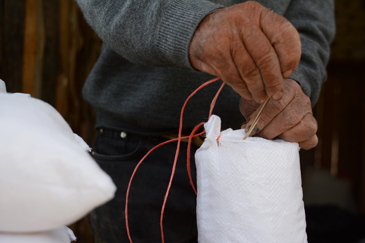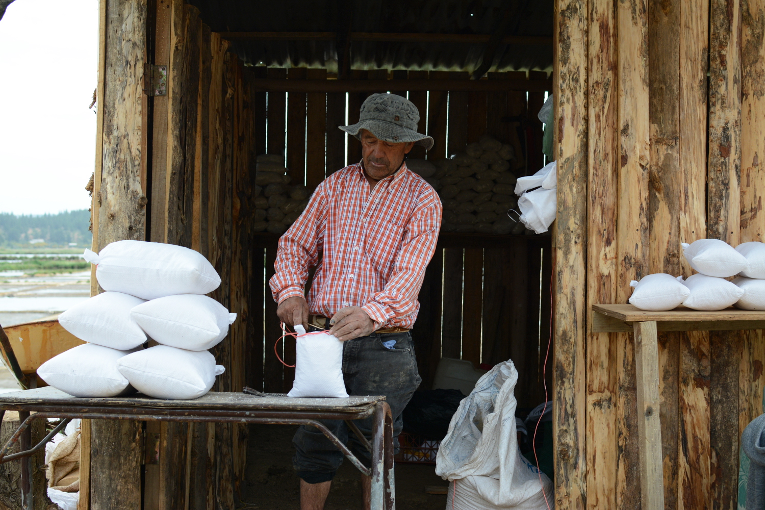 The salt season was just about to start when we visited. The salt-makers were finishing preparation of their flats –clearing them of the winter’s debris, mud and algae– and waiting for the full moon and high tide to bring the ocean waters flowing into the lagoon. We watched as one man, Jorge, carefully apportioned last year’s harvest into little white sacks, meticulously sewing each shut with needle and twine, the way it’s been done for years and years. So simple and so beautiful. We bought a small bag and packed it among our essential supplies. A taste of Chile that will travel with us as we continue our journey.