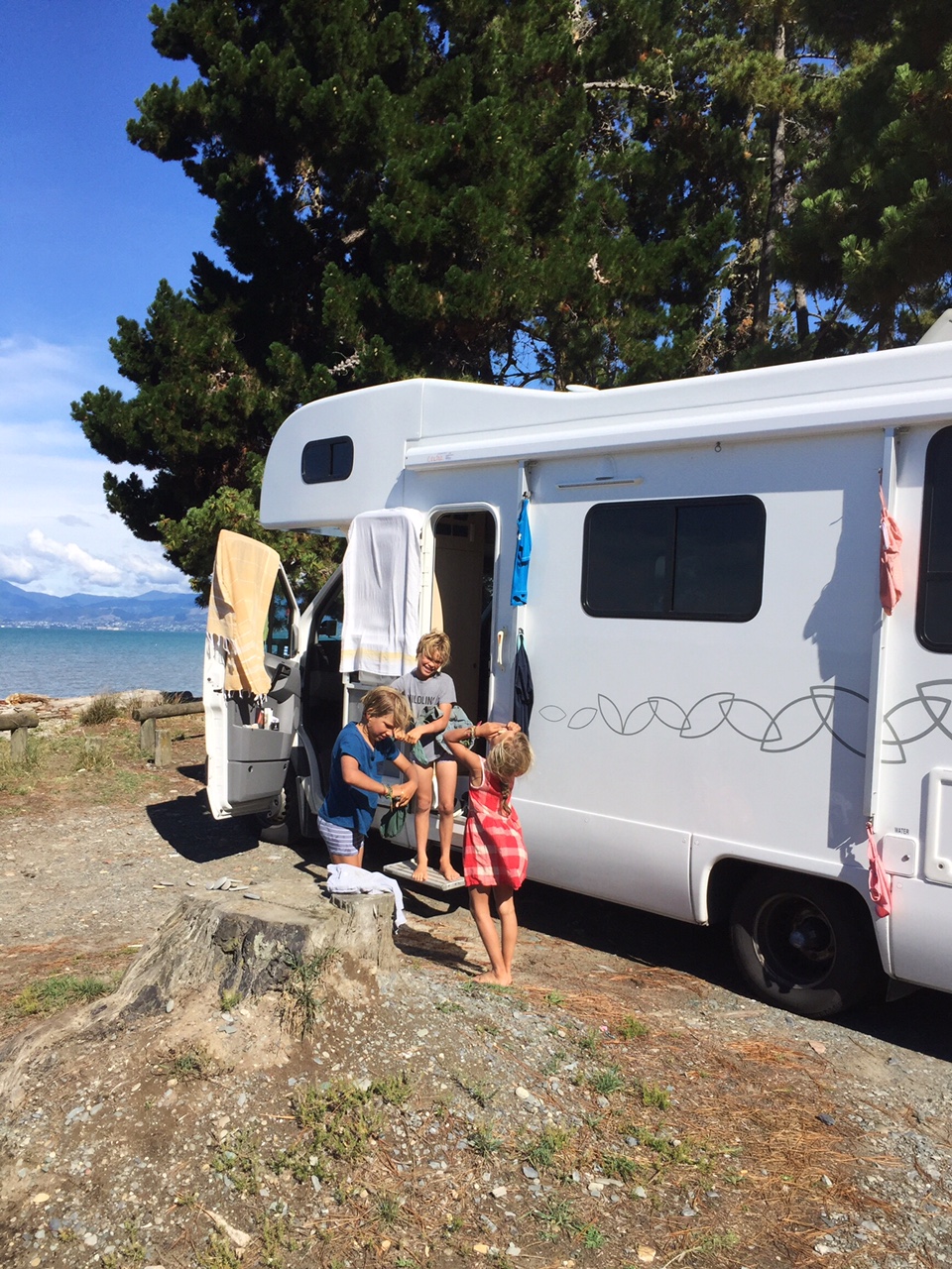 Day 6: We awoke to a misty morning. Though we wanted to spend more time in Punakaiki the forecast was no better than the days before. A kind person on Instagram mentioned that it was warm and sunny up in the Abel Tasman region, so we plotted a course straight there. We put an audio book on for the kids and made the long drive all the way up to the top of the South Island. The rain cleared as we drove north and by the time we reached Katiterie beach, the sun was shining and it looked distinctly summer-like. We immediately pulled over, let the kids change into swimsuits, slathered on sunblock, and within five minutes we were sitting on golden sands watching the kids play along the river and beach! This is the beauty of travelling by campervan – you always have everything you need for any adventure – whether it’s raincoats or swimsuits. We camped that night in Marahau (about 8kms further north) and enjoyed dinner outside the van for the first time!!
