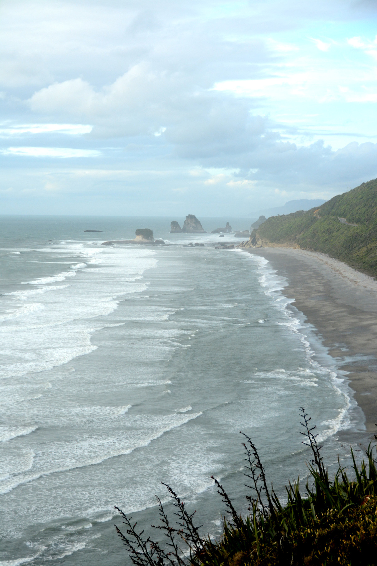 We hadn’t intended to go all the way to Punakaiki, but did not find any inspiring campsites before it. We’re so happy we made the distance. Nearing Punakaiki the landscape suddenly transforms, the beauty (of normally beautiful NZ) triples before your eyes. Here lush mountains are punctuated by dramatic outcrops of limestone and cliffs, dotted with palm trees, giant tree ferns and utterly draped in all of the other magnificent species of native bush. We settled for the night at the Punakaiki Beach Camp, nestled between the towering cliffs and the Tasman Sea. One of our favourite campsites so far (they even had a wood-fired stove and drying room for our soggy goods!), we immediately decided to settle in this pretty spot for two nights. We enjoyed an evening wander along the beach and didn’t even mind the sand flies attacks–such was its beauty.