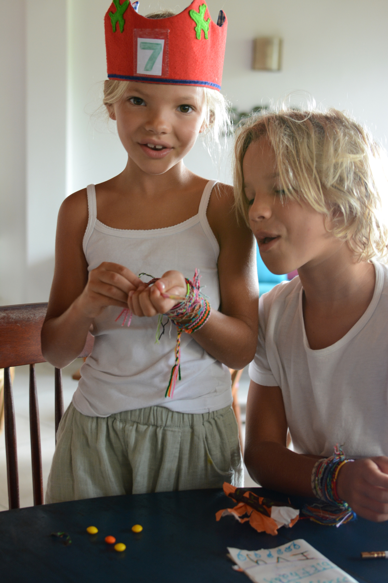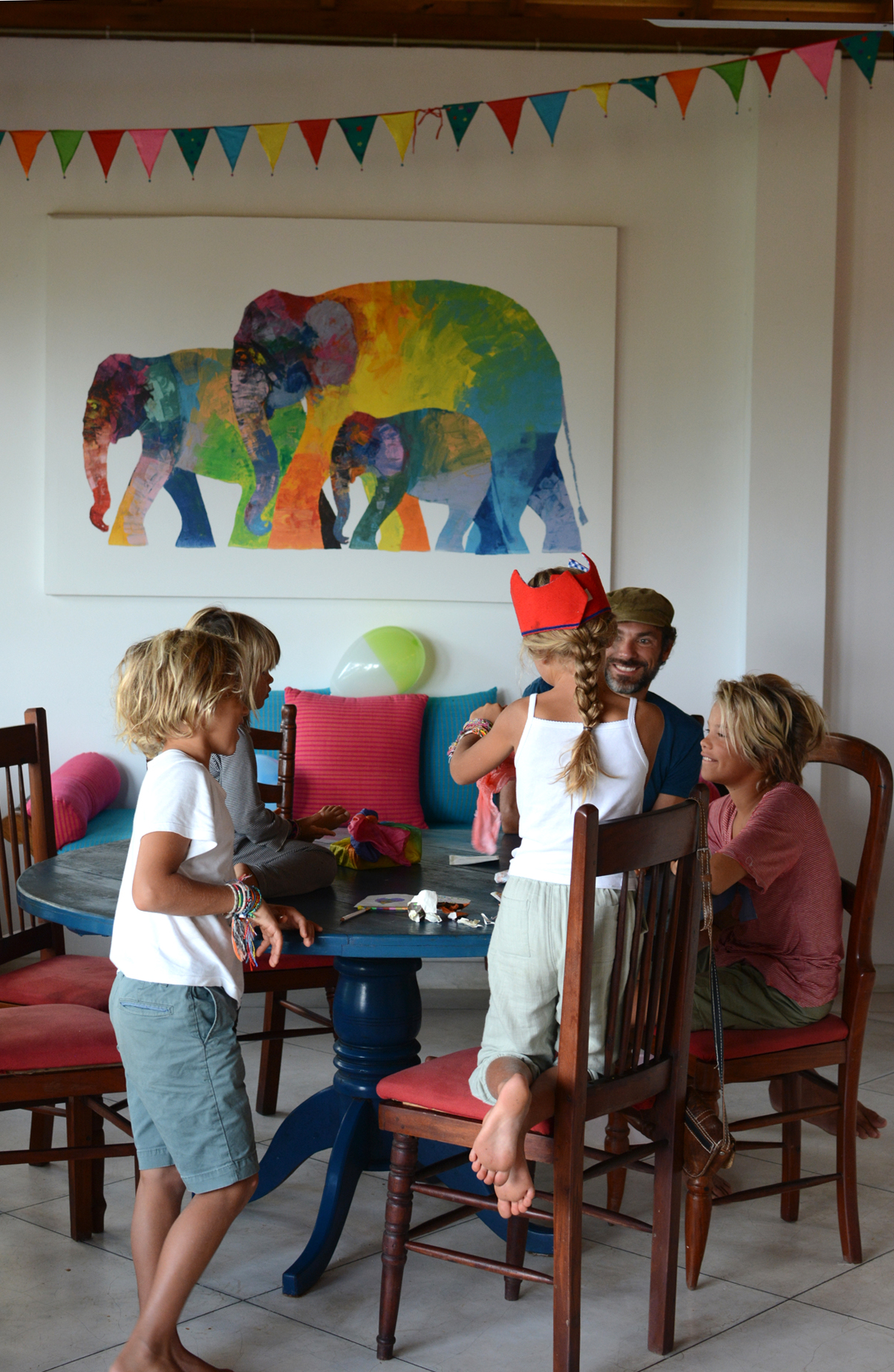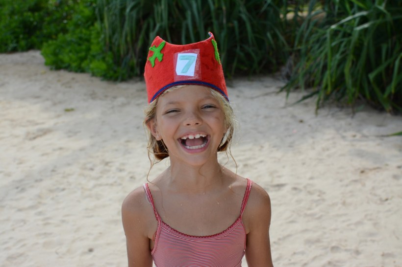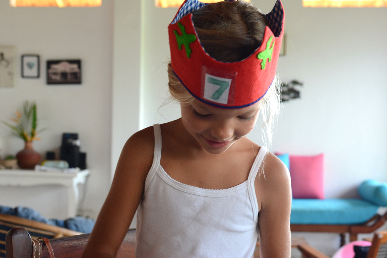 On Ivy’s 7th birthday, we woke early when she came running into our bedroom. We played ‘Brown Eyed Girl’ from Michael’s phone and I picked Ivy up and danced with her in the bedroom. We all walked upstairs together where Michael had hung the bunting the night before. She donned the birthday crown, opened a few small presents, read cards from her brothers, and then we ate the breakfast she had requested: crepes filled with Nutella and banana, aside a plateful of tropical fruit.