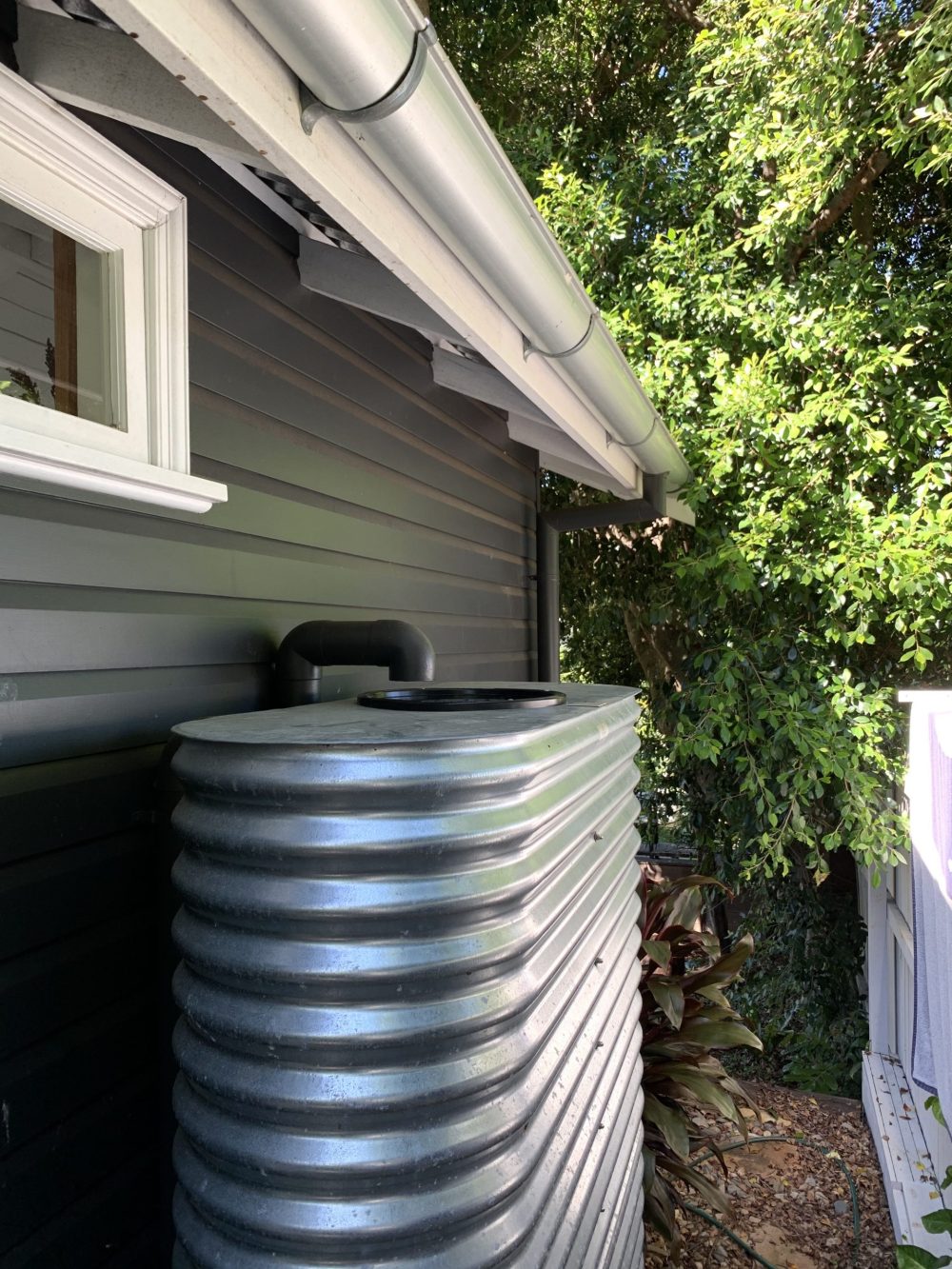 - When we built our studio, we bought a rain water collection tank to put at the back of it. When it rains, the tank fills up and we use that tank for watering our garden, rinsing our wetsuits, and for any other non-drinking purpose.
